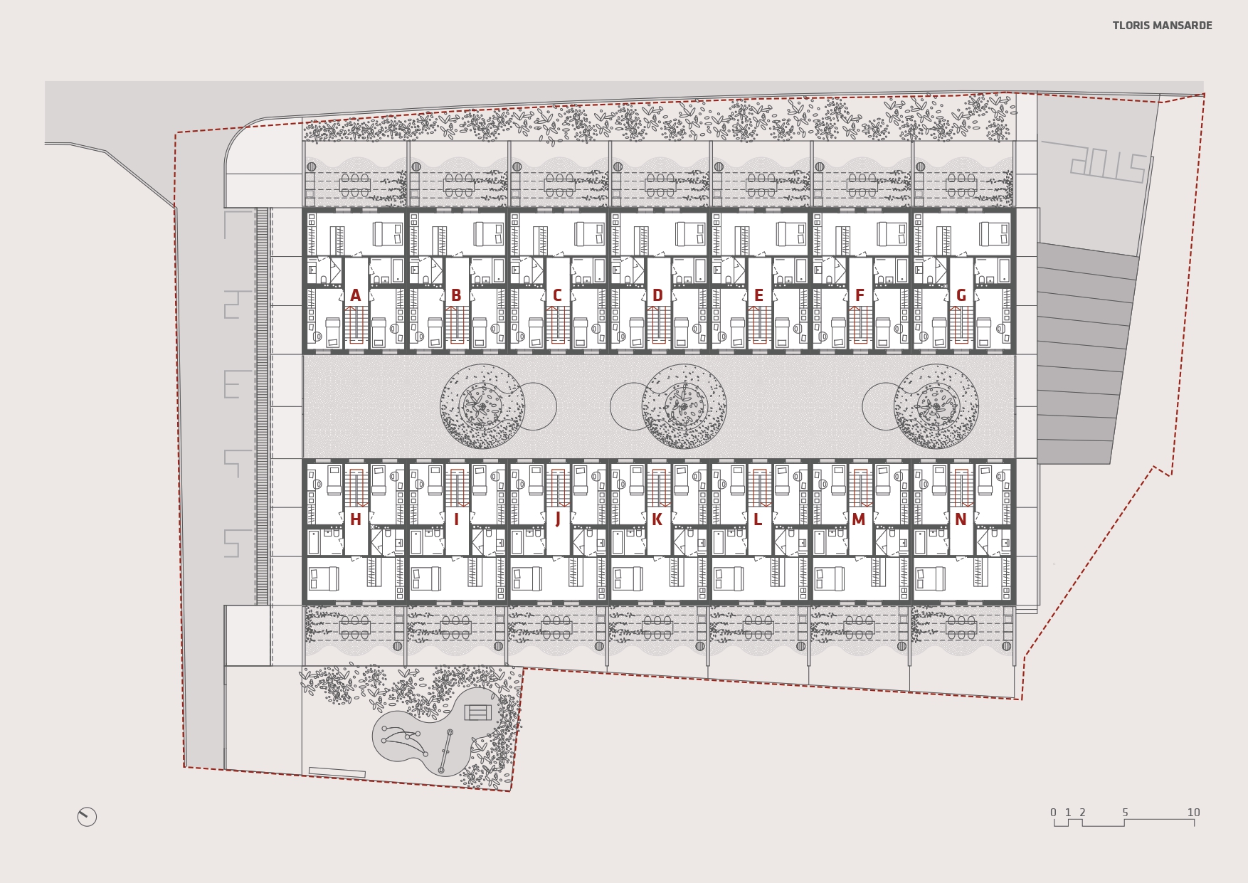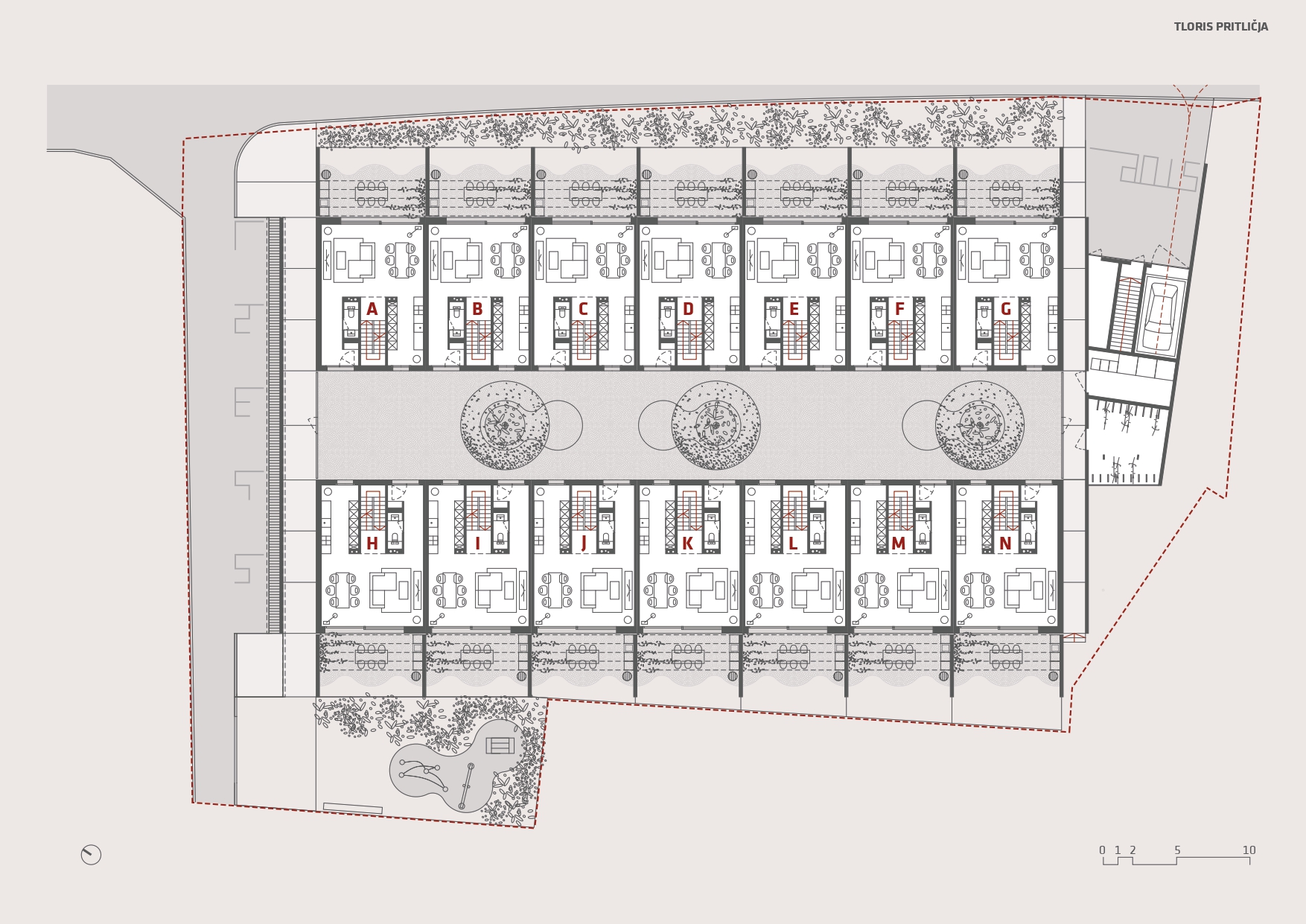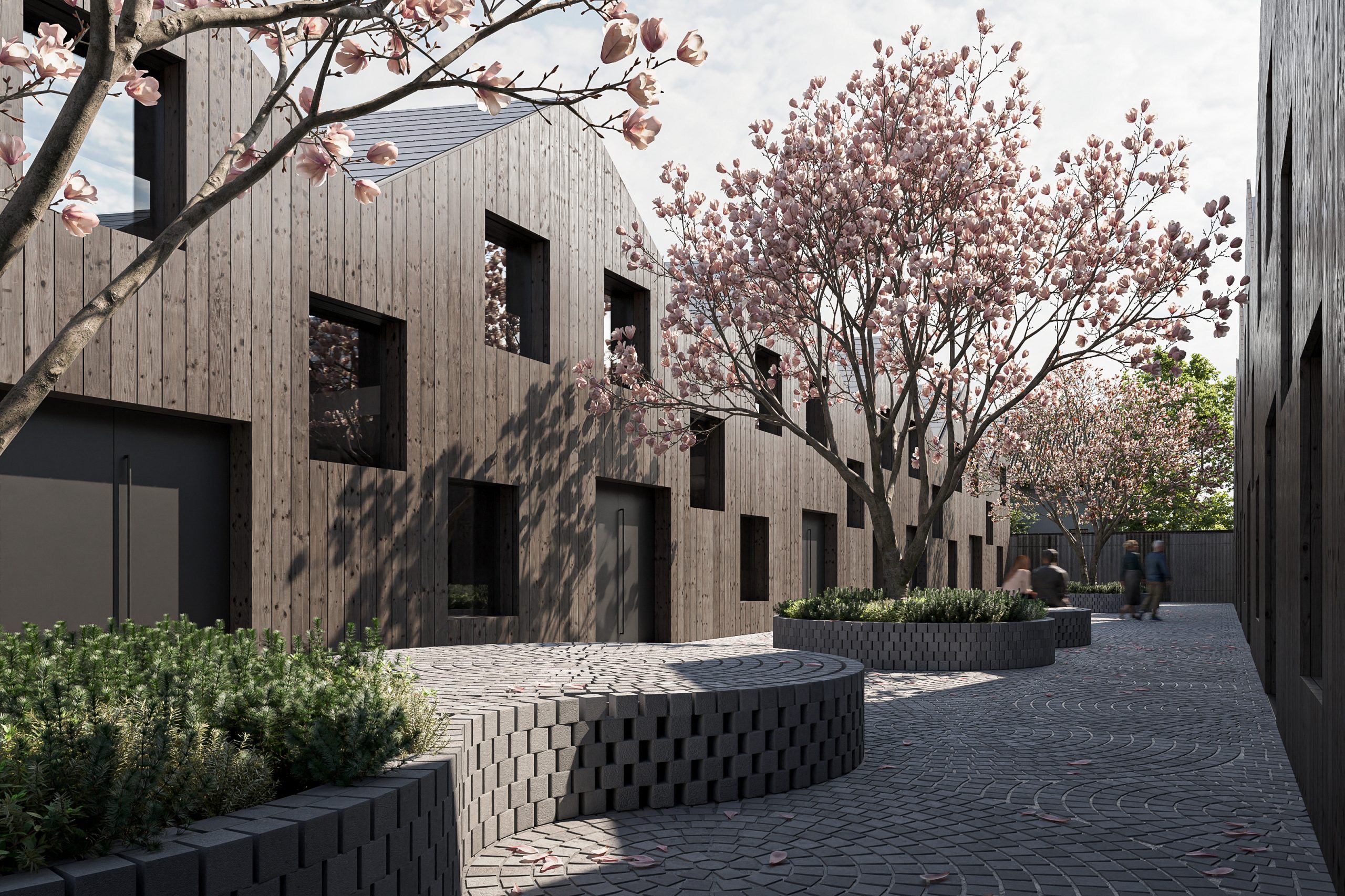 Z namenom zagotavljanja enotnosti in skladnosti vse hiše vključujejo dvorišče in ohranjajo enakomerna tlorisna načrta, kar zagotavlja usklajeno življenjsko okolje za prebivalce. Sedem hiš je obrnjeno proti vzhodu, medtem ko je preostalih sedem obrnjeno proti zahodu, kar ponuja raznolike poglede in možnosti naravne svetlobe.